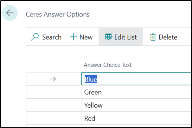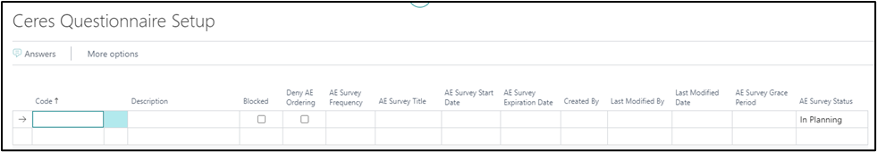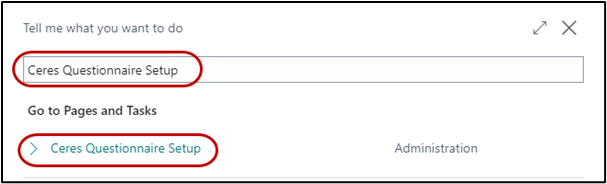 - Ceres Questionnaire Setup can be accessed by selecting “Search” from the Dynamics 365 Business Central Banner and entering “Ceres Questionnaire Setup” in “Tell me what you want to do” then selecting “Ceres Questionnaire Setup” from the results in the Go to Pages and Tasks section OR by selecting the “Ceres Questionnaire Setup” menu action (if present) from your Role Center home page.
