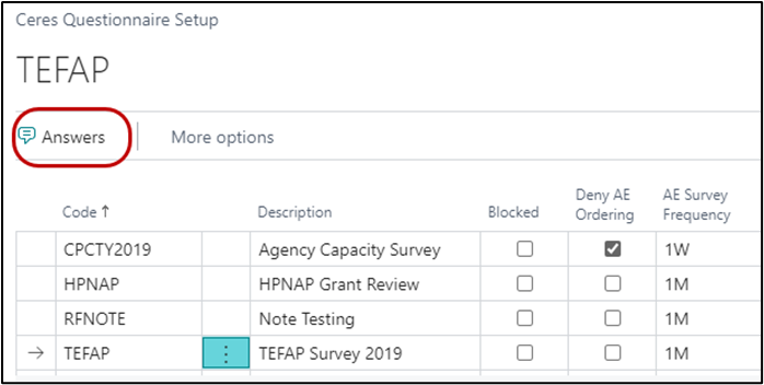 - Next, we will assign the questions required for this Questionnaire and define the allowed answers. To Define the Answer, click on (highlight) the Questionnaire you wish to work with and then click on Answers.