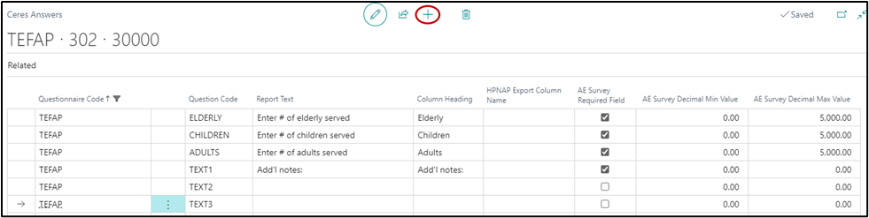 - The Ceres Questionnaire Setup window will open. A list of all Questionnaires currently defined will be displayed. Click the plus (+) to create a new question.