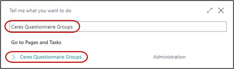- Ceres Questionnaire Groups can be accessed by selecting “Search” from the Dynamics 365 Business Central Banner and entering “Ceres Questionnaire Groups” in “Tell me what you want to do” then selecting “Ceres Questionnaire Groups” from the results in the Go to Pages and Tasks section OR by selecting the “Ceres Questionnaire Groups” menu action (if present) from your Role Center home page.