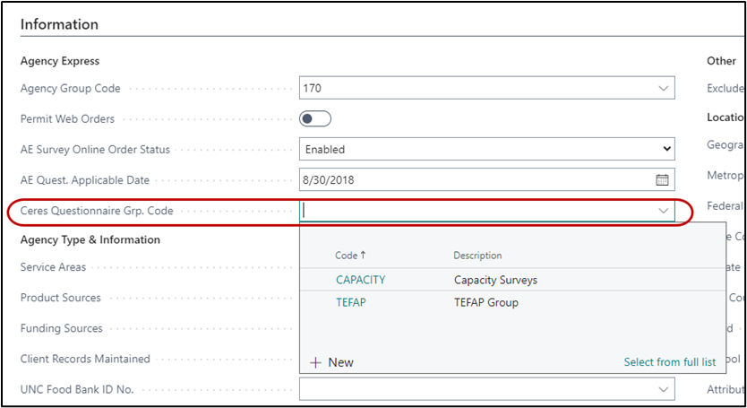 - Lastly, for each Agency to which the Ceres Questionnaire applies, specify the Ceres Questionnaire Group Code on the Information FastTab of the Agency Card.