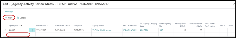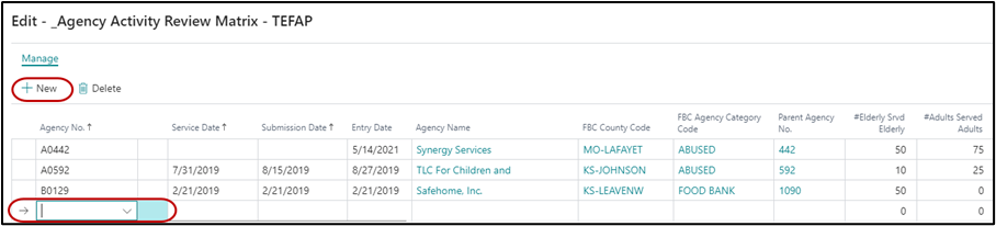 - Select Manage à New to add a new review or just begin entering information on the first blank line in the window: