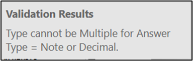 - Type = Multiple only applies to Answer Type = Multiple Choice or Answer Type = Text. If you try to set Type = Multiple on Answer Type Decimal or Note an error will be generated: