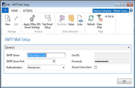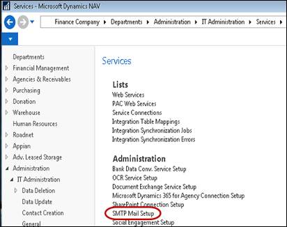 To access SMTP Setup, select Departments à Administration à IT Administration à Services à Administration à SMTP Mail Setup: