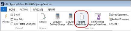 In Ceres, a web order must be validated before it can be processed. When an order is imported from the web, it comes into Ceres with just the basic information (i.e., Agency No., Shipment Date, Appointment Date, Item No., Quantity, etc.). Ceres must “validate” this information to ensure there are no errors. If it is able to do so, the rest of the fields on the order header and lines will populate and we may proceed with order processing.