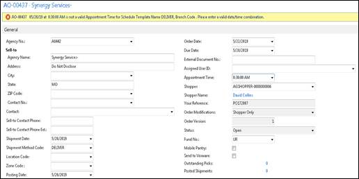 Appointment Time: The projected appointment time for the order. This is initially assigned by the shopper when the order is submitted online. It can, however, be changed at any time by the food bank if deemed necessary.