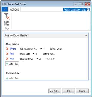 Note: You can also filter by Shipment Method Code, Schedule Template, etc. to further restrict the orders that will be processed.