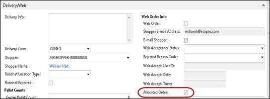 Once the allocated order has been transmitted to the web, the Web Allocation Status field will change to “Sent to Web”. At this point, the order is waiting to be accepted by the shopper online. Until that happens, the order will be locked and cannot be edited. Once the shopper accepts the order, the Web Allocation Status will change to Accepted by Shopper and the Web Order flag will be checked. At that point, the order can be treated as a normal web order.