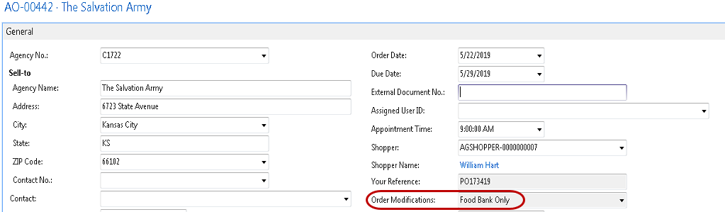 Note: This field cannot be directly modified. To change Order Modifications from Shopper Only to Food Bank Only, you must use the Process action in the Agency Order Actions list. Also, if you are set up to send an ASN On Processing (Agencies & Receivables Setup à Web E-mail), an e-mail will be automatically generated once Order Modifications changes from Shopper Only to Food Bank Only. See previous section for further detail.